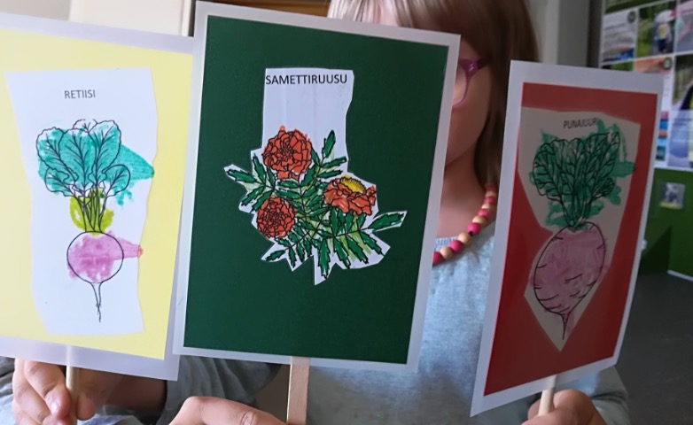 Tarvikkeet: värikyniä, sakset, liimaa, teippiä, kartonkia, (laminointivälineet), tulostetut värityskuvat halutuista kasveista. Linkki värityskuviin alla.