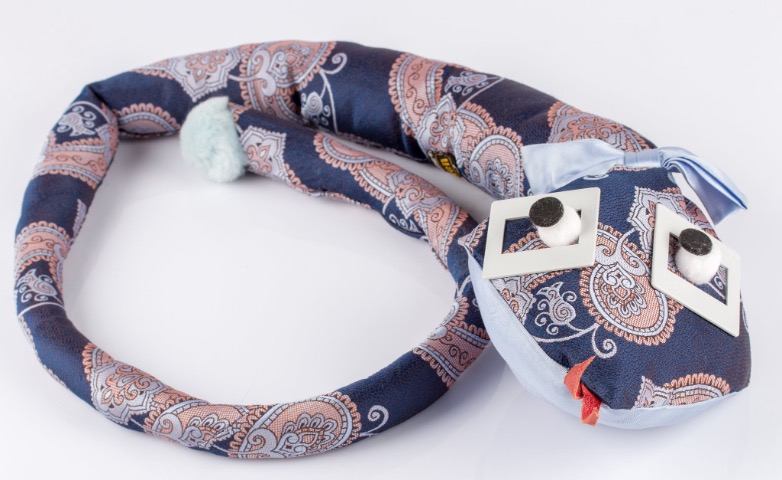Avaa kravatin saumaa sen verran, että saat täytettyä sen vanulla tai kangassilpulla. Harsi täyttöaukko kiinni ja kiinnitä samalla kieli, jos teet käärmeen. Kiinnitä silmät ompelemalla tai kuumaliimalla. Kaulaan voi lisätä vaikka rusetin.